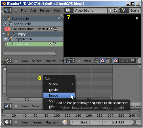 - 將游標移動到顯示 Sequencer 的 Video Sequence Editor 視窗,按 SHIFT+A 選新增 Image。