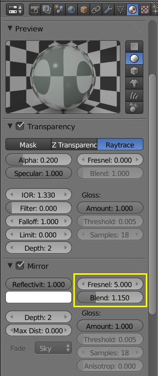 如上圖的金屬球,球的中心與視線夾角為 0,邊緣與視線夾角為 90 度。Fresnel 欄位的數值愈大、全反射的角度範圍愈小(0 表示沒有菲涅耳效應,Blende 參數無法使用)。Blend 欄位控制的是反射效果的轉換幅度,數值愈小,愈早開始鏡面反射;愈大則無反射區延伸的愈遠。